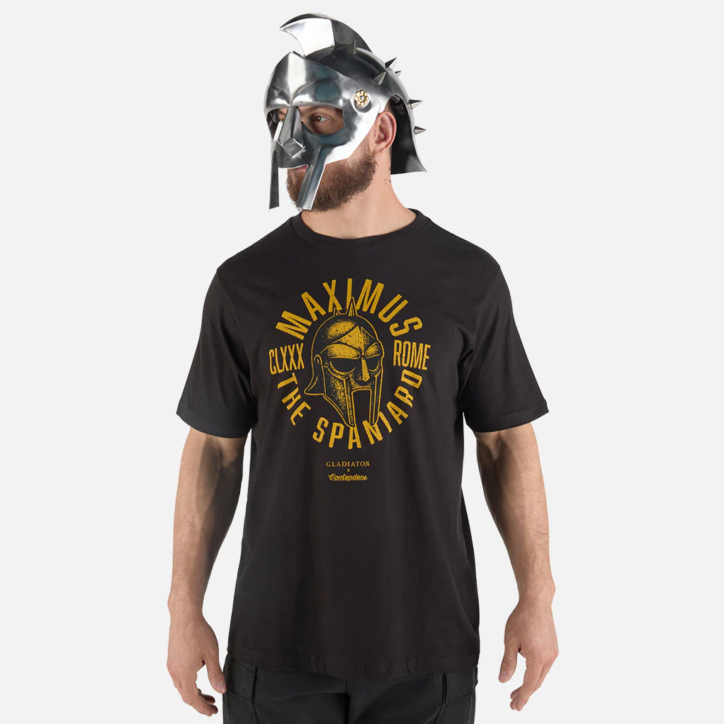 This officially licensed Gladiator tee pays homage to the man who fought as a general, a slave, and a legend in the arena, Maximus Decimus Meridius, known to the crowd as The Spaniard. Featuring a distressed helmet graphic framed with MAXIMUS – THE SPANIARD – ROME, this bold front design honors the warrior who became a symbol of resistance and honor. Wear this striking graphic to carry the spirit of The Spaniard who was a fighter who turned pain into power and legacy into legend.